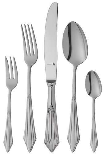 - Zestaw sztućców 30 el. Fächer renomowanej niemieckiej marki WMF. Zestaw wyróżnia się eleganckim wyglądem. Posiada stylizowane, przedwojenne kształty uchwytów. Przeznaczony dla 6 osób.